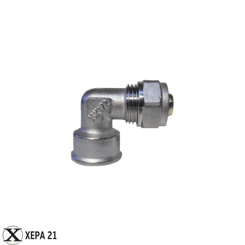 Женското коляно Ф16 х 1/2" е изключително функционален компресионен фитинг, който служи за преход от многослойна тръба към резбово съединение под прав ъгъл. Този модел е незаменим при свързване на радиаторни кранове, душ батерии или перални машини, където изводът на тръбата трябва да бъде подреден и компактен.